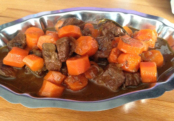 Ajoutez le jus d'orange et laissez cuire 2 min. Puis ajoutez la bière, 50 cl d'eau, la vergeoise, le laurier, le cumin et les clous de girofle. Portez à ébulition, couvrez puis baissez le feu pour laissez mijoter 2h45. Ajoutez les carottes 1h avant la fin de la cuisson.